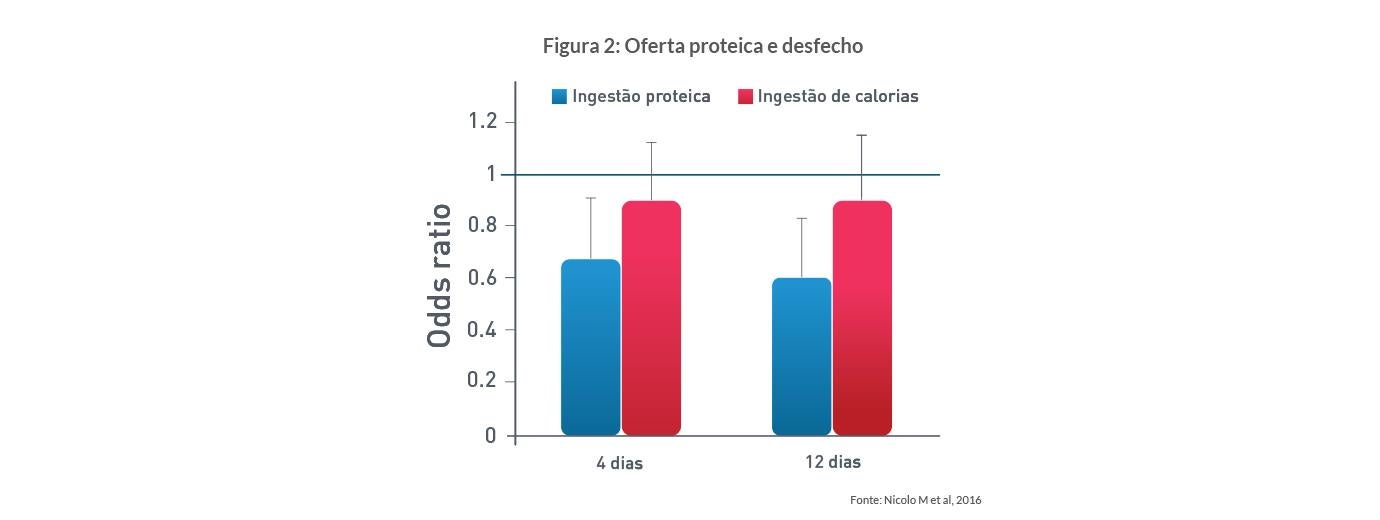 Existem poucos estudos que compararam diferentes ofertas proteicas e o desfecho clínico de doentes graves. Um deles avaliou prospectivamente 113 pacientes internados em UTI e observou uma correlação entre a oferta proteica e a mortalidade, sendo que pacientes que receberam uma oferta proteica por volta de 1,5/kg/dia sobreviveram mais (p=0,011).9 Outro estudo prospectivo observacional com 886 pacientes em ventilação mecânica, que tinha como objetivo atingir a meta energética guiada por calorimetria indireta e a proteica fixada em no mínimo 1,2 g/kg, mostrou que atingir tais metas se associou com diminuição da mortalidade em 28 dias de até 50%.10