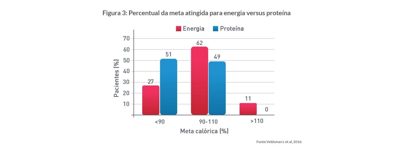 Outro estudo recente demonstrou que quando a meta proteica não foi atingida, em pacientes que receberam em média 64% do prescrito, isto ocasionou um déficit proteico médio de 298g (152-523g). Aqueles que tiveram déficit cumulativo superior a 300g apresentaram um risco quase 2 vezes maior de internação prolongada na UTI e no hospital, maior tempo de ventilação mecânica e 1,5 vezes mais probabilidade de complicações.14