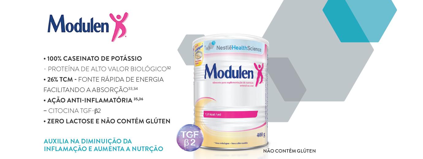 O produto Modulen® é uma dieta polimérica para manutenção e recuperação do estado nutricional. Pode ser utilizado por via enteral ou oral, como terapia nutricional suplementar no pré e pós-operatório. É um produto com mais de 10 estudos realizados nos últimos anos.