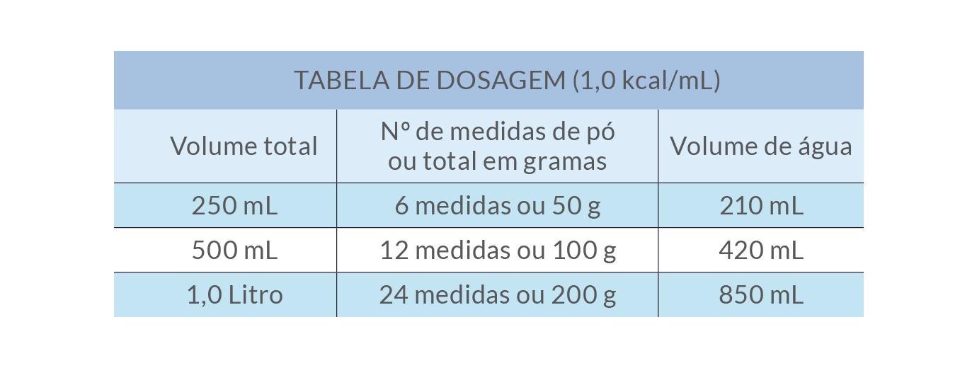 Dois estudos com o produto sugeriram a utilização diária de 500 a 700 kcal para pacientes com idade média de 11 anos. Já a ESPEN recomenda que 600 kcal/dia sejam utilizadas como suplementação da dieta normal do paciente. A estimativa de consumo de Modulen® varia de 500 - 1200 kcal/dia, que significa 2 a 5 copos ao dia.